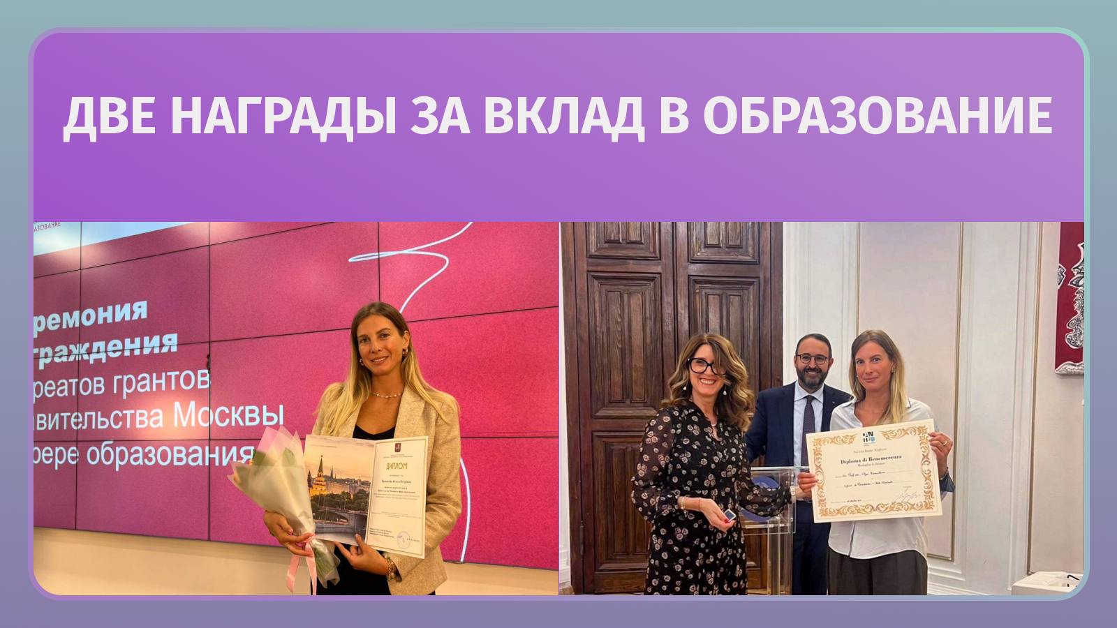 Грант Правительства Москвы — за выдающийся вклад в развитие образования, преданность профессии и внедрение передовых языковых методик.